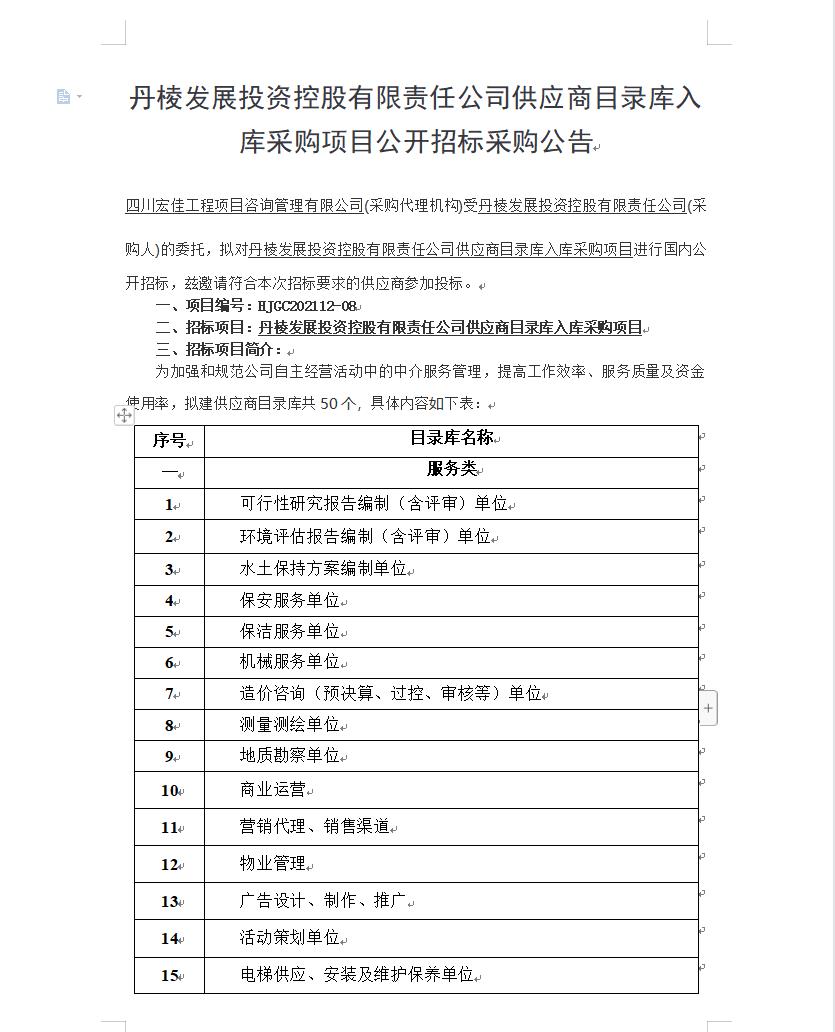 【丹發(fā)展公司】丹棱發(fā)展投資控股有限責(zé)任公司供應(yīng)商目錄庫入庫采購項目公開招標采購公告