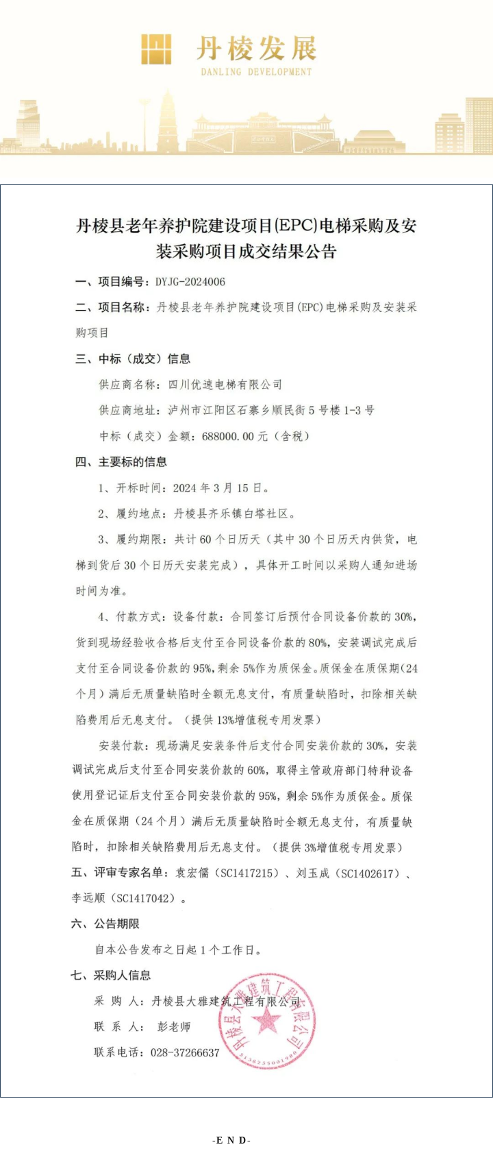 丹棱縣老年養(yǎng)護院建設(shè)項目(EPC)電梯采購及安裝采購項目成交結(jié)果公告