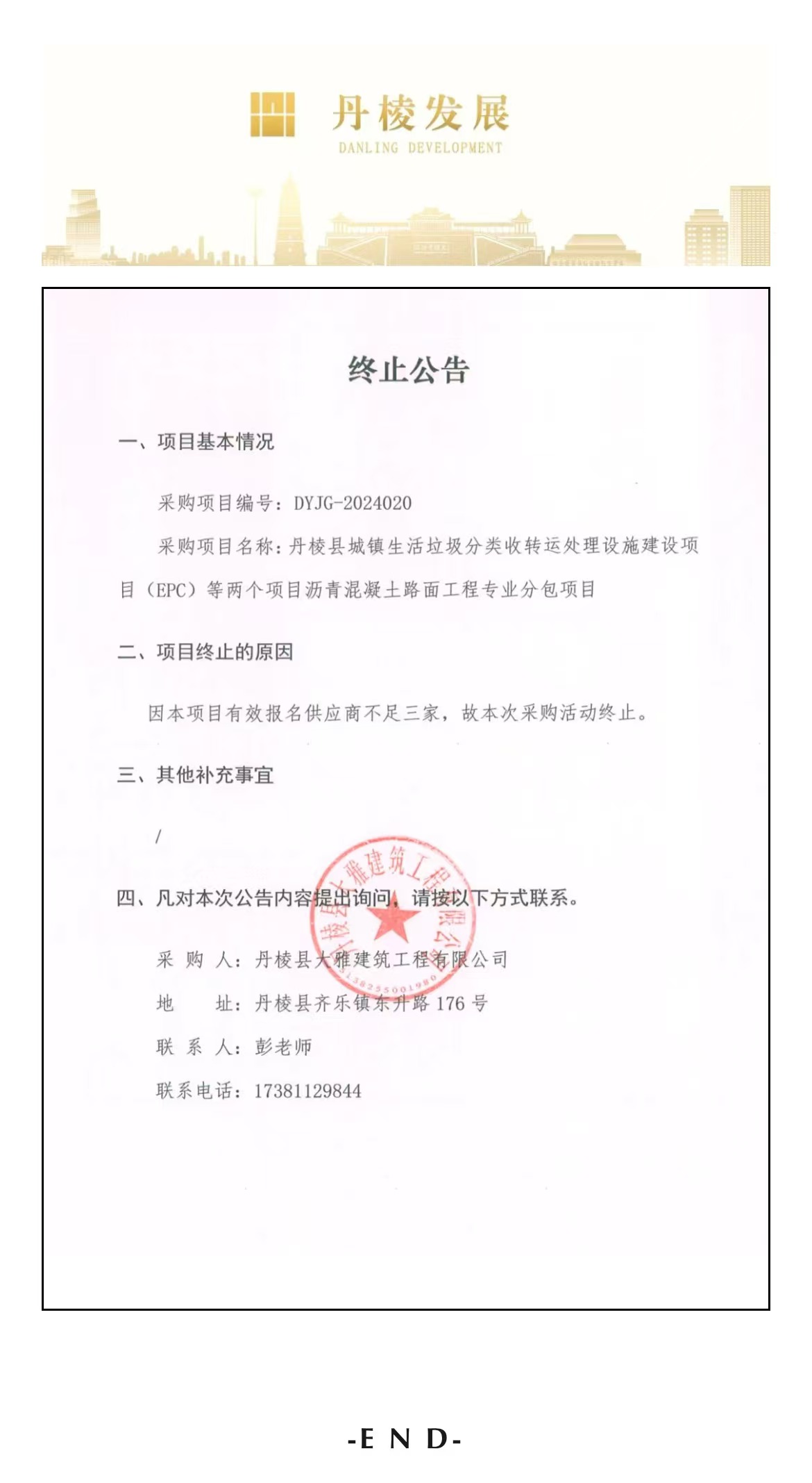 丹棱縣城鎮(zhèn)生活垃圾分類收轉運處理設施建設項目(EPC)等兩個項目瀝青混凝土路面工程專業(yè)分包項目終止公告