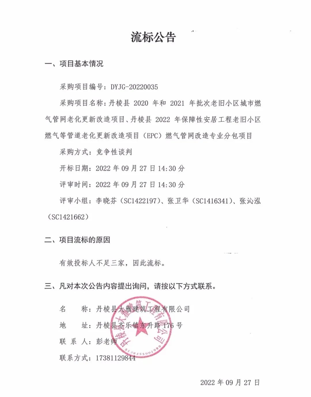 丹棱縣 2020 年、2021年及2022年批次老舊小區(qū)城市燃氣管網老化更新改造項目燃氣管網改造專業(yè)分包項目流標公告