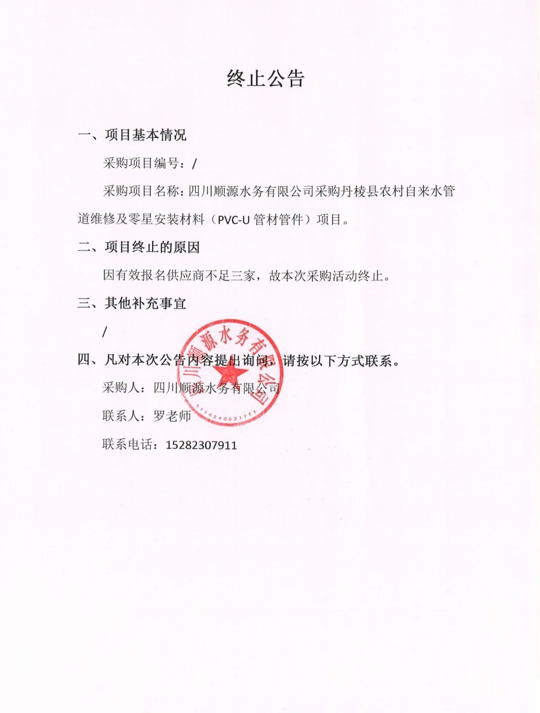 四川順源水務(wù)有限公司采購(gòu)丹棱縣農(nóng)村自來水管道維修及零星安裝材料(PVC-U管材管件)項(xiàng)目終止公告