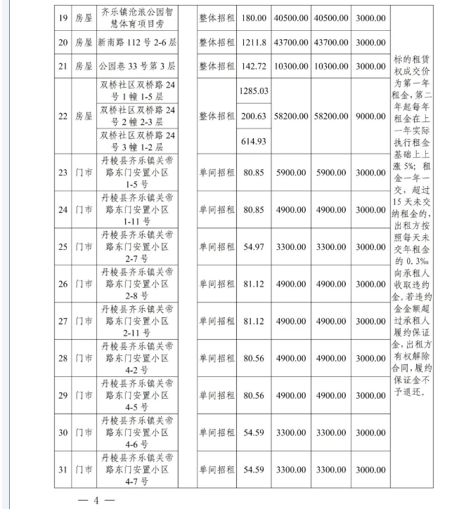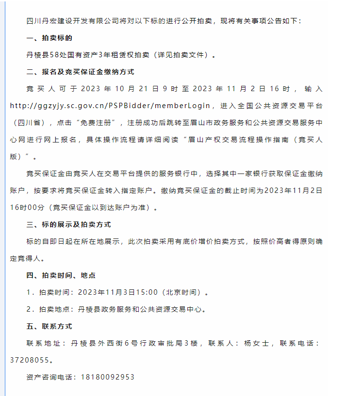 丹棱縣58處國(guó)有資產(chǎn)3年租賃權(quán)拍賣(mài)公告